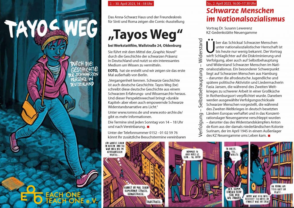 Vom 02. bis zum 30. April ist im KinOLaden jeden Sonntag von 14.00 bis 18.00 Uhr (und nach Vereinbarung) die Ausstellung “Tayos Weg” zu sehen, die mit den Mitteln der Graphic Novel durch die Geschichte der schwarzen Präsenz in Deutschland führt. Die Ausstellung wurde vom Verein EOTO (Each One To Each One) erstellt, der sich für die Belange schwarzer, afrikanischer und afrodiaspiasporischer Menschen einsetzt und ist erstmals außerhalb von Berlin zu sehen. Eröffnet wird die Ausstellung am 02. April um 16.00 Uhr mit einem Vortrag von Dr. Susann Lewerenz von der KZ-Gedenkstätte Neuengamme zum Thema “Schwarze Menschen im Nationalsozialismus. Verfolgung – Selbstbehauptung – Widerstand”. Im Vortrag werden ausgewählte Verfolgungsschicksale Schwarzer Menschen vorgestellt, die während des Zweiten Weltkriegs in das Konzentrationslager Neuengamme verschleppt wurden.