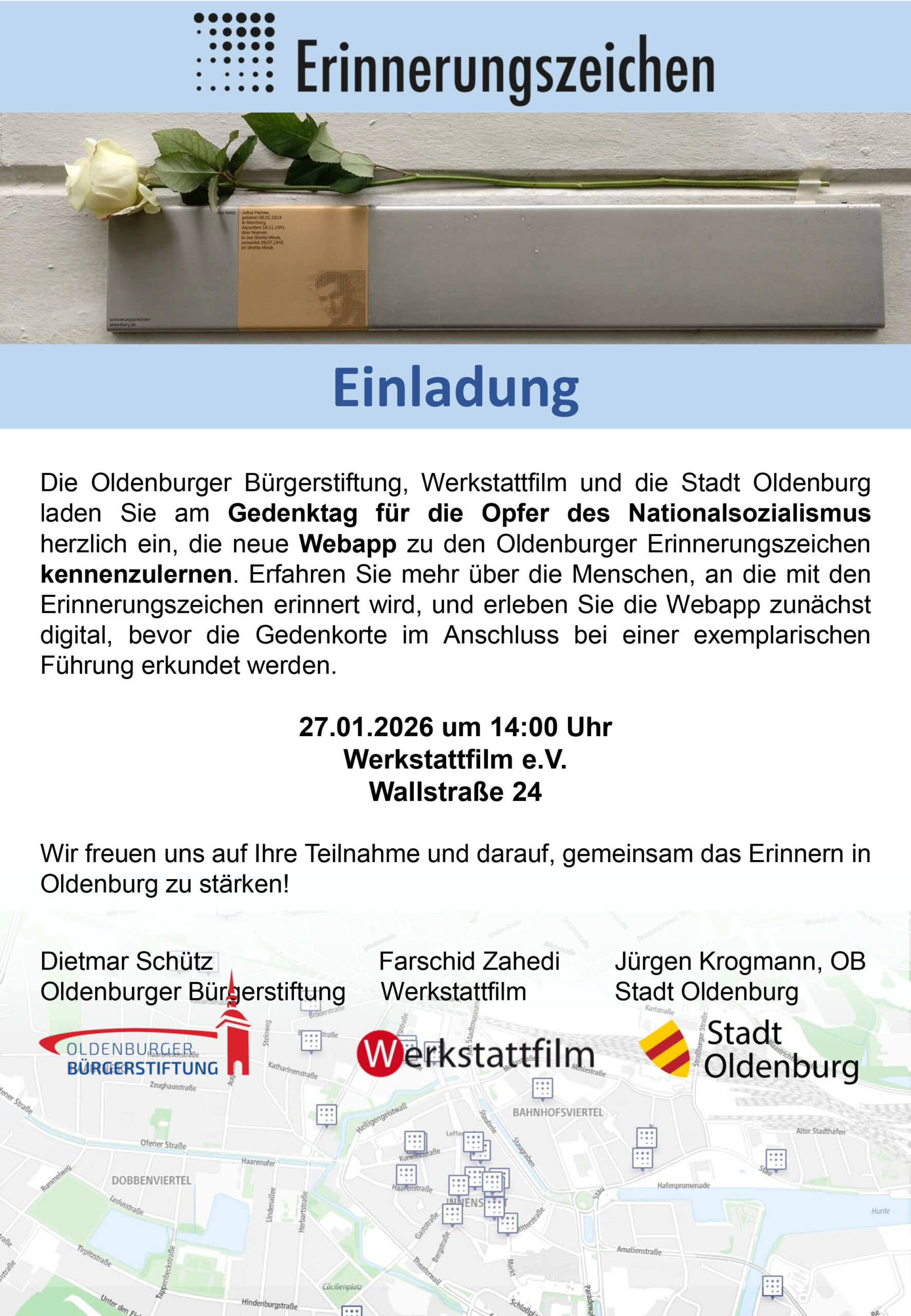 DieOldenburgerBürgerstiftung,WerkstattfilmunddieStadtOldenburgladenSieamGedenktagfürdieOpferdesNationalsozialismusherzlichein,dieneueWebappzudenOldenburgerErinnerungszeichenkennenzulernen.ErfahrenSiemehrüberdieMenschen,andiemitdenErinnerungszeichenerinnertwird,underlebenSiedieWebappzunächstdigital,bevordieGedenkorteimAnschlussbeieinerexemplarischenFührungerkundetwerden.27.01.2026 um 14:00 UhrWerkstattfilm e.V.Wallstraße 24WirfreuenunsaufIhreTeilnahmeunddarauf,gemeinsamdasErinnerninOldenburgzustärken! ...