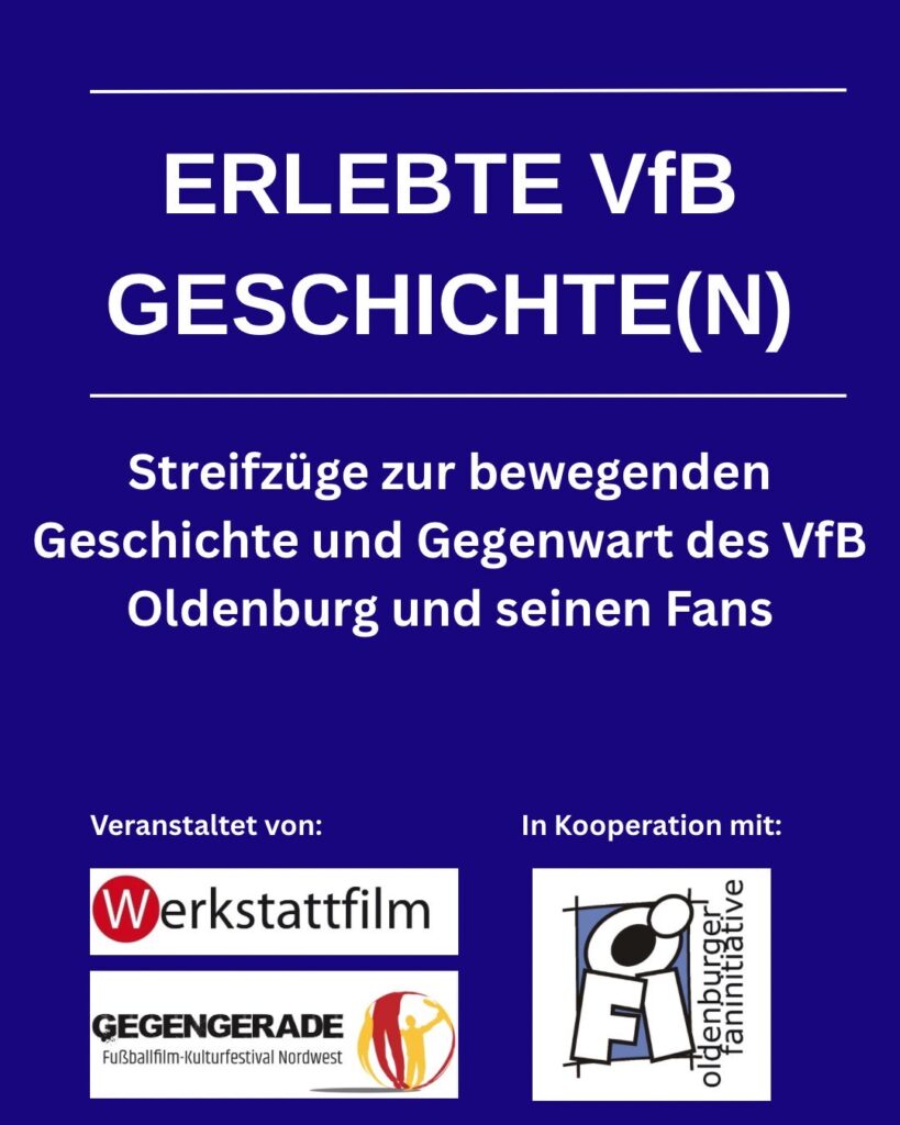 Seit vielen Jahren beschäftigt sich Werkstattfilm e.V. mit dem Verein, seinen Fans und seiner Identität. Wir möchten die Geschichte des VfB Oldenburg sichtbar und erlebbar machen und mit allen interessierten Menschen ins Gespräch gehen, die diese miterlebt haben und an kommende Generationen weitergeben möchten.