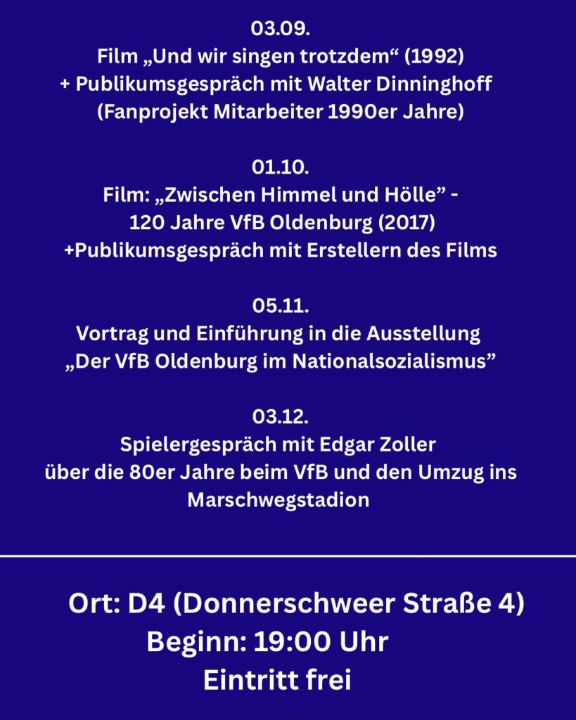 Seit vielen Jahren beschäftigt sich Werkstattfilm e.V. mit dem Verein, seinen Fans und seiner Identität. Wir möchten die Geschichte des VfB Oldenburg sichtbar und erlebbar machen und mit allen interessierten Menschen ins Gespräch gehen, die diese miterlebt haben und an kommende Generationen weitergeben möchten.