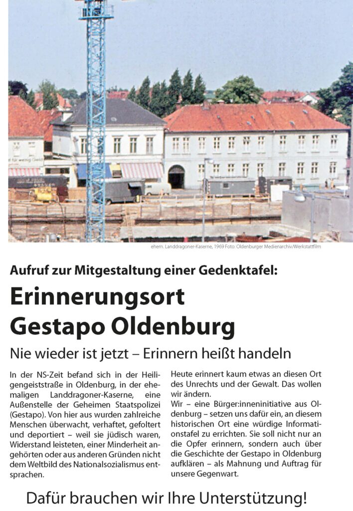 In der NS-Zeit befand sich in der Heiligengeiststraße in Oldenburg, in der ehemaligen Landdragoner-Kaserne, eine Außenstelle der Geheimen Staatspolizei (Gestapo). Von hier aus wurden zahlreiche Menschen überwacht, verhaftet, gefoltert und deportiert – weil sie jüdisch waren, Widerstand leisteten, einer Minderheit angehörten oder aus anderen Gründen nicht dem Weltbild des Nationalsozialismus entsprachen.