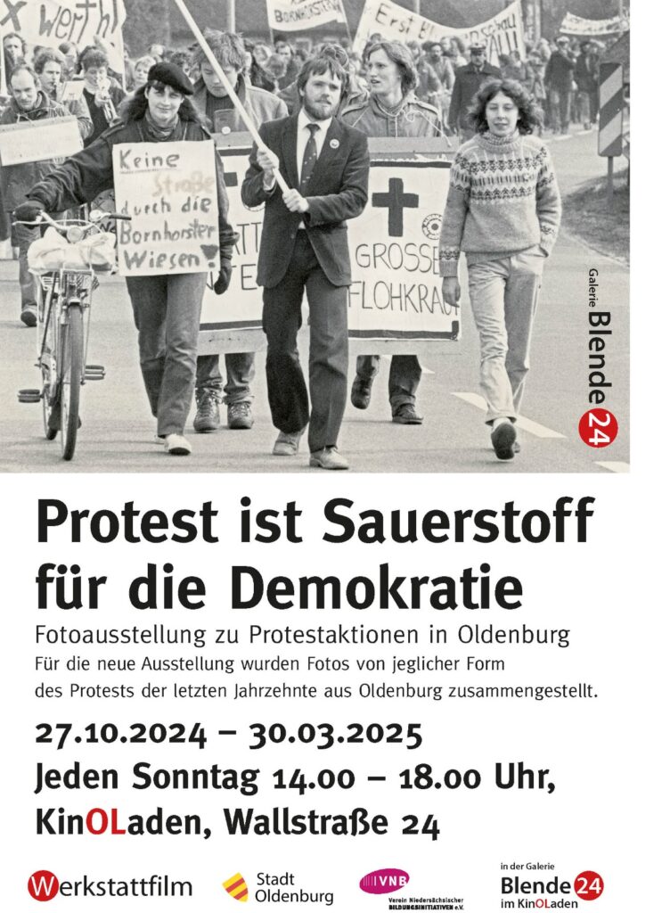 Ausstellung; „Protest ist Sauerstoff für die Demokratie“ der Blende 24 im KinOLaden. Für die Ausstellung wurden Fotos von jeglicher Form des Protests der letzten Jahrzehnte aus Oldenburg zusammengestellt. Es werden diverse Formen und Inhalte gesellschaftlichen Protests zum Beispiel zu den Themen Natur/Umwelt, Politik/Gesellschaft und Regionales gezeigt. Die Fotografien stammen von Fotograf*innen aus Oldenburg und Umgebung. Die Fotos wurden speziell für diese Ausstellung zur Verfügung gestellt sowie aus dem Fundus zeitgenössischer Fotografie des Oldenburger Medienarchivs ausgewählt. Sie repräsentieren eine Spannbreite verschiedener Inhalte und Zeiträume der Proteste in Oldenburg.